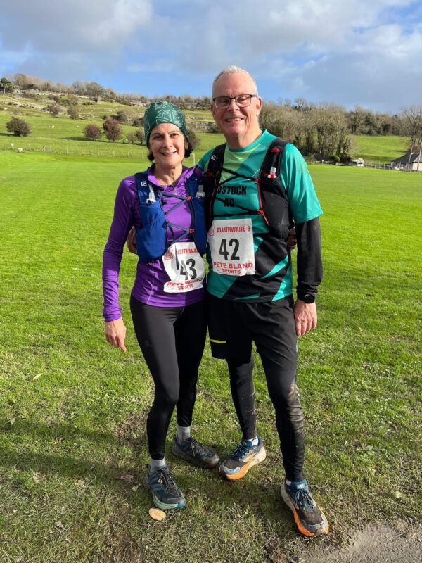 Well, it turned out to be much better than we expected. The rain cleared to leave a sunny morning, although with a chill wind. The race started and finished at the community centre in the village of Allithwaite, just outside Grange-over-Sands. Our very own Mary White was also running, this being her fourth time here. The course was a clockwise loop, initially a mostly uphill mixture of minor roads, tracks and fields. A muddy wooded trail brought us down to the Cartmel racecourse and then we headed east for the run-walk (for me at least) up Hampsfell to the hospice (no, not that sort of hospice – this is a squat stone tower at the top of the fell overlooking the Cartmel valley). There were fantastic views from the fell of Morecambe Bay, the Leven estuary and the southern lakeland fells. With great timing I took a muddy slide onto my side on the downhill from the fell just as I passed the photographer (what did I say about fell running?). Continuing the undulating downhill brought us back into the village for the finish.