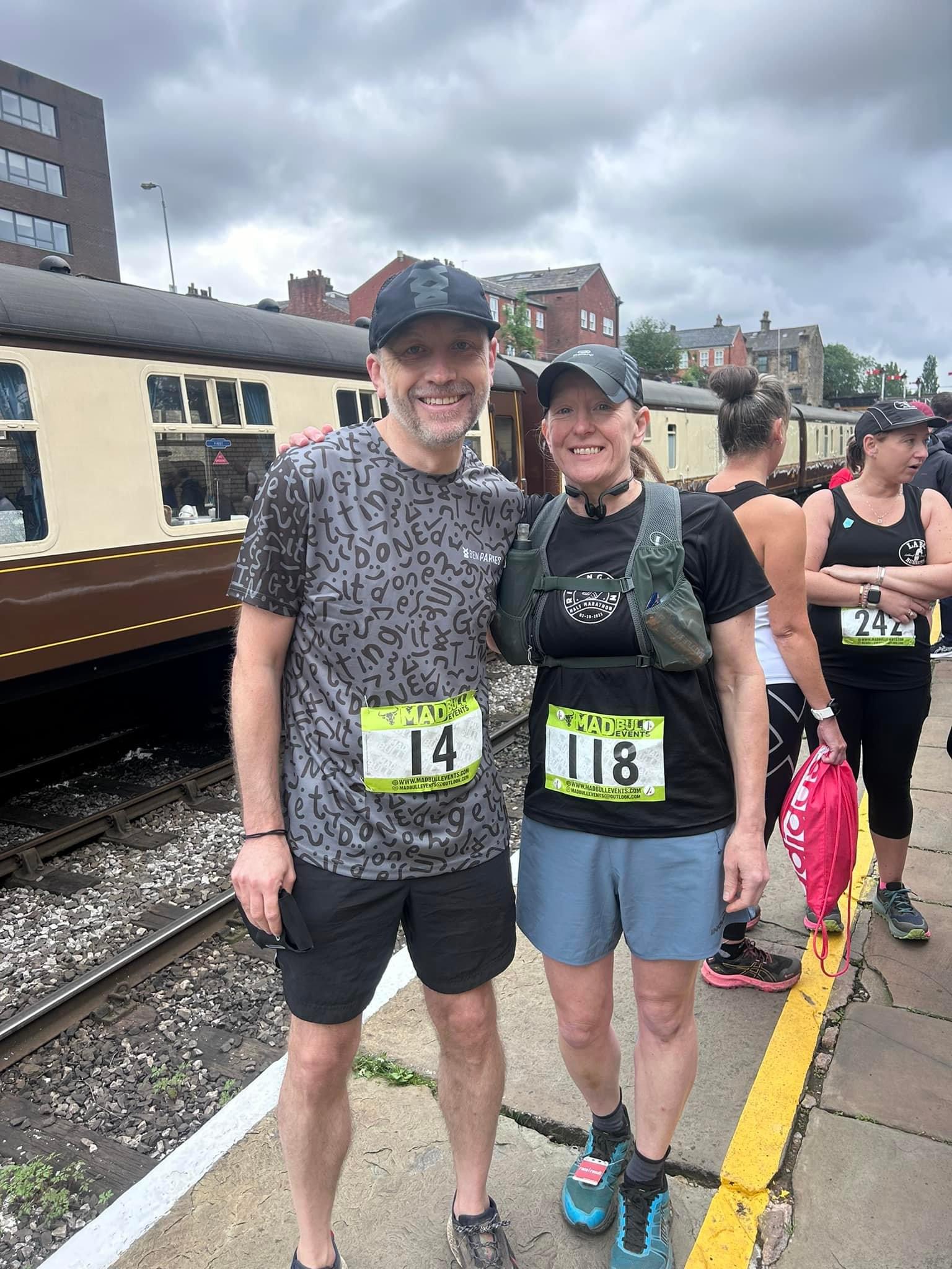 Chris and Rachel H headed to Bury to compete in the Madbull Race the Train event. This is tough multi terrain race, taking in trails, roads, running tracks, fields and steps! The race covers 10 miles starting at Bury Train station,to the whistle of the train. As the train departs the station runners set off Race the Train