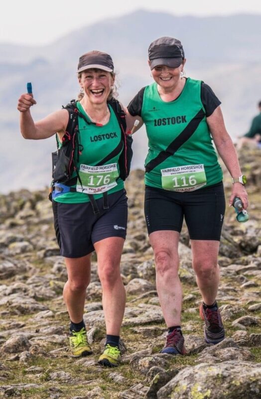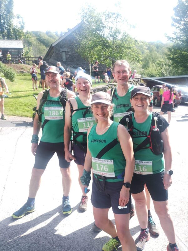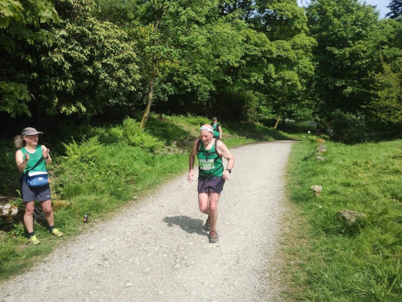 Saturday saw the Ambleside AC organised Fairfield Horseshoe fell race take place from the beautiful Rydal Hall in the Lake District. 5 intrepid ‘geen vests’ made the trip north for the latest round of the club fell champs. Advertised as 9 miles and 3000 feet of climb the race took place in sweltering 24 degree heat, pleasant for a stroll but a bit hot for racing! 218 intrepid runners crossed the start line and headed of up to the first of 8 summits and checkpoint 1 at Nab Scar. I had decided on the usual ‘not racing, just want to get round ‘ strategy, however that went out of the window (as usual) as soon as I saw Shutters just in front of me on the start line! I’d passed him before 100 metres were out of the way! From checkpoint 1, runners pushed slowly upwards along the ridge with beautiful views across lakeland over Heron Pike to Great Rigg and checkpoint 2. By now the field had started to thin out and fortunately a nice breeze now accompanied the runners. Pushing on over the highest summit of fairfield at 2800 ft the decent, over Hart Crag, high and low Rigg’s, unlike the ascent which loosely follows the main path is characterised by several fell running lines, avoiding the rocky sections and fortunately I managed to find most of them and passed a good dozen runners on the way down! Then about 1 km from the end, my recent bout of illness took its toll and all the energy disappeared. ‘Come on Marlow its only one km on a flat track into the finish’ I told myself to no avail as I ended up walking at least half of that but managed to find something to run over the finish line! A free can of ice cold pop was pushed into the hands of all runners as they finished, a fantastic touch on such a hot day. Despite the finish I was very pleased with my race and time considering the heat. Shutters was close behind me, with Amanda and Josie, who was carrying an injury finishing just in front of the intrepid Checkers. All in all this was a fantasticly organised race and the attention to detail for the welfare of the runners in such sweltering conditions was second to none.