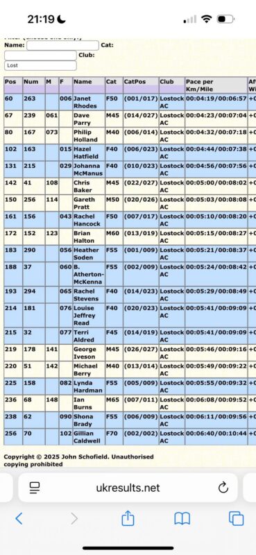 There are too many people to mention (and quite frankly Iβm too tired lol) but HUGE shout out to Janet, who, despite running a 32 mile ultra on Saturday stormed home again as first Lostocker, 6th female overall & of course another age cat win. Different class πππ. Another brilliant performance was from Heather, storming home in her age category, thatβs some going in a high quality field, massive well done πππ.