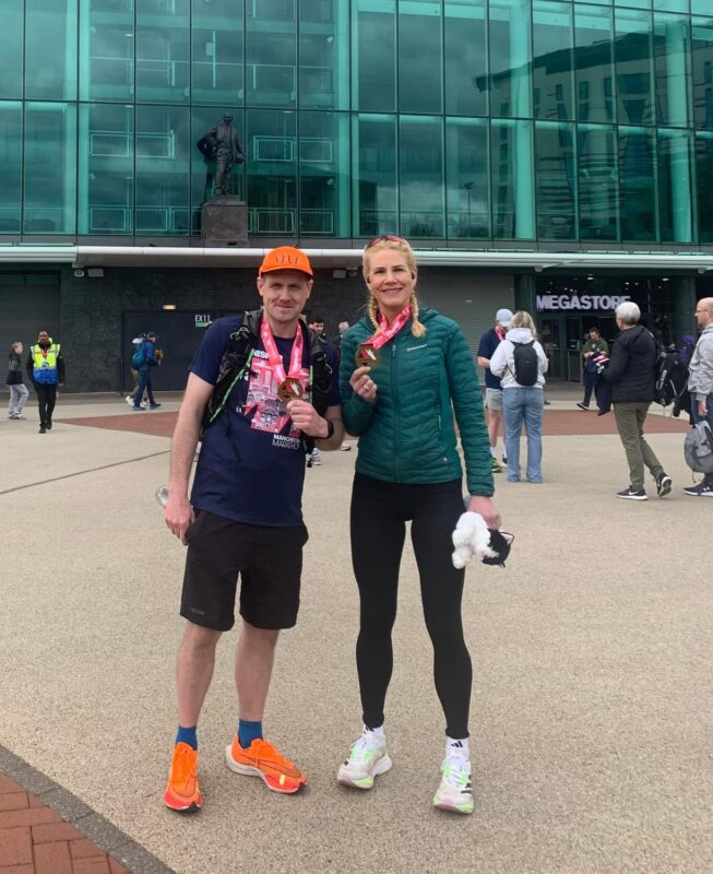 The crowds were incredible in cheering me on, all shouting my name. Mile 23 and my mum appeared with Jelly babies and said “come on you can do this” . Final 500m felt like a lifetime. Seeing Gaz from Lostock at the finish line was a welcome sight.