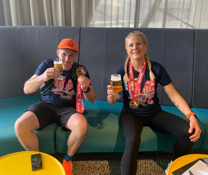 My First Marathon yesterday. Started really well. Things began to slip at 17 mile marker. My heart sank when the 4hr pacer went past. I managed to keep with it for a while but i couldn’t keep it going. My first encounter with the dreaded wall. Definitely the hardest run to date. Massive thanks to Mel and Neil for the lift and the beer after. She gave me lots of advice and settled my nerves on the start line . I Managed to stay with her until Mile 3 and then had Janet and Gareth in my head saying ” slow down Greg Mels in another league , pace yourself”. Running through Deansgate with Tina Turner belting out simply the best will live with me for ever.