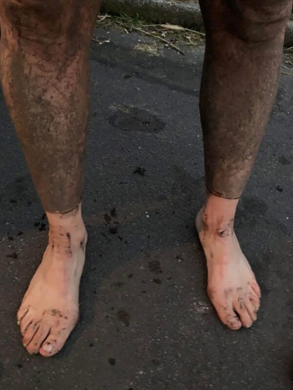 Once the summit has been reached, runners retrace their muddy steps back the way they they came across the bogs. I’d pulled away from Shutters early on but had no idea that he had me in his sights and was pulling me in! After a steep, fast run down a road, a final muddy run across the sports field & into the finish where Tom & Tony cheered us in.