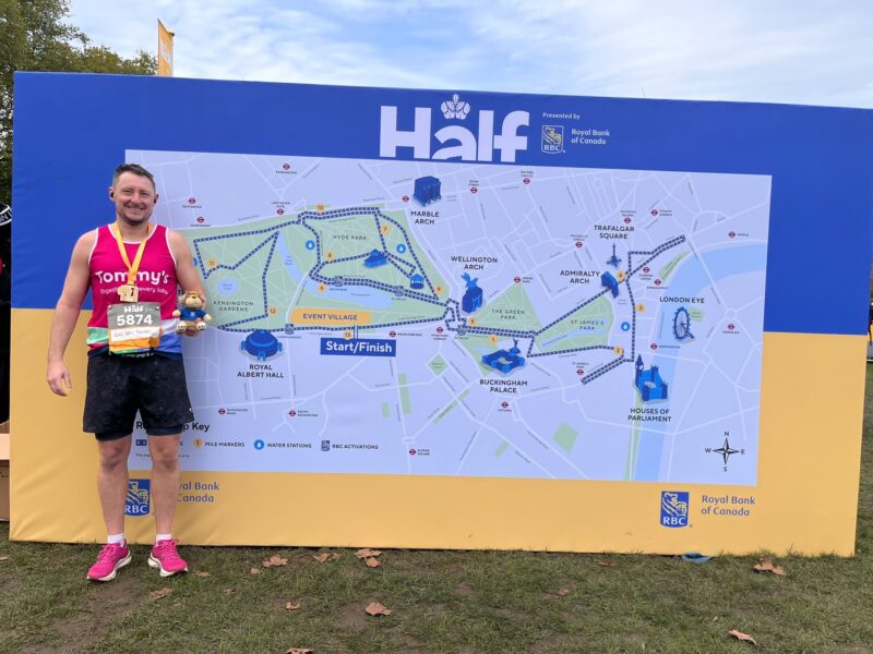 At the 5 mile point, runners re entered Hyde Park and the final 8 miles circled the narrow paths of the park. This was an extremely busy race with 18,000 participants. Gaz had a fantastic race getting a new 1/2 marathon PB and finishing in 1:43:01. Gaz was running to raise money for the Charity Tommy’s and to date has raised over £800.