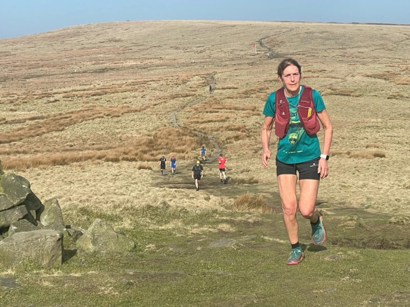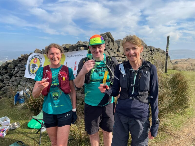 Three Lostockers completed the Two Crosses Challenge event on Sunday in glorious running weather. Greg Kilshaw, Sally McCoy and Janet Rhodes completed the 18 miles together in 3 hours and 43 minutes and finished joint 25th out of 254 competitors. The event is organised by the East Lancashire Long Dustance Walkers Association and takes place annually every March, this being the 39th year the event has been held. There’s a choice of either an 18 or 26 mile route and you can walk or run it. Both routes visit the Roman Cross at Affetside and the Pilgrim’s cross on Holcombe Moor. The event is very popular and competitors return year after year. It is famous for both its beautiful scenery, challenging terrain and the most magnificent feed stations, well stocked with trifle, rum and soup served by the cheery Marshall volunteers. It’s also an absolute bargain to enter and a really enjoyable route with highlights including a visit to Peel Tower with its lovely grassy descents and some great trail running around Bradshaw fisheries and Entwistle reservoir.